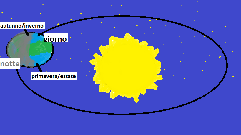 • alternanza di dì/notte e delle stagioni: dipende dalla Terra che, come se fosse un pallone, gira intorno a se stessa e al Sole (moti di rotazione e rivoluzione);