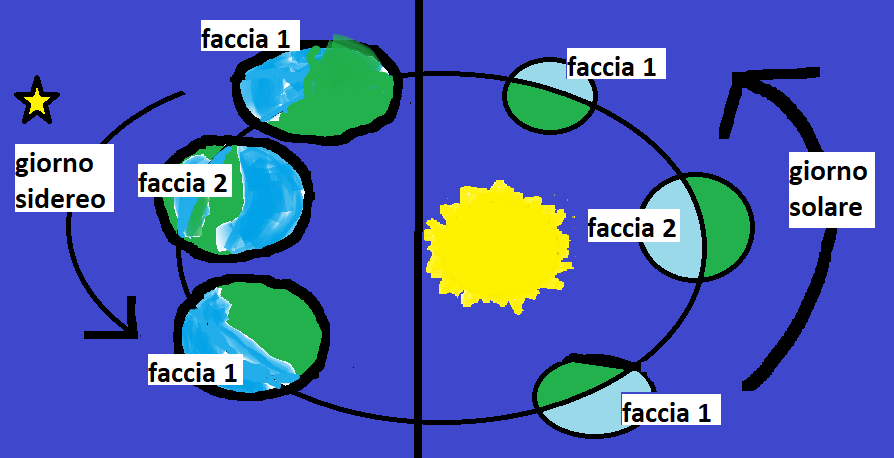 • diversa durata del giorno solare e del giorno sidereo: Il giorno sidèreo è il tempo compreso fra due passaggi consecutivi di una stella sullo stesso meridiano, cioè quando la Terra, girando su se stessa, guarda con la stessa faccia la stessa stella; la sua durata, pressoché invariabile, è di 23 ore e 56 minuti, che è quindi quanto impiega il nostro pianeta per compiere un’intera rotazione. Data l’enorme distanza Terra-stella, si trascura il moto aggiuntivo di rivoluzione. Se però consideriamo il giorno solare, esso è l’intervallo di tempo compreso fra due passaggi consecutivi del Sole sullo stesso meridiano (stessa faccia del pianeta). Esso è più lungo di circa 4 minuti del giorno sidèreo (24 ore), non essendo più trascurabile lo spostamento che la Terra compie intorno al Sole, dato che come stella consideriamo appunto quest ultimo.